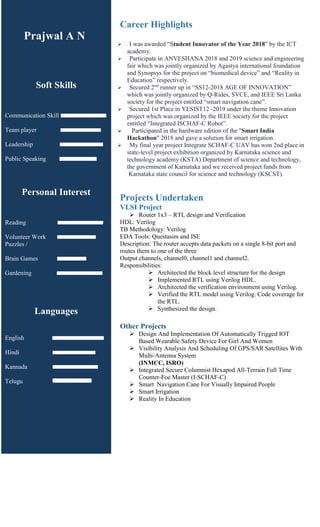 Prajwal provides a concise summary of his background and qualifications. He aims to use his skills and knowledge to deliver value and job satisfaction while achieving personal and organizational goals. He has a bachelor's degree in technology and specialized training in VLSI design and verification. His experience includes internships in mechatronics, satellite technology, and FPGA development. He has strong skills in Verilog, SystemVerilog, simulation tools, and microcontrollers. Prajwal has received awards for his innovative student projects and publications. He seeks to contribute as a team player with communication skills and leadership abilities.