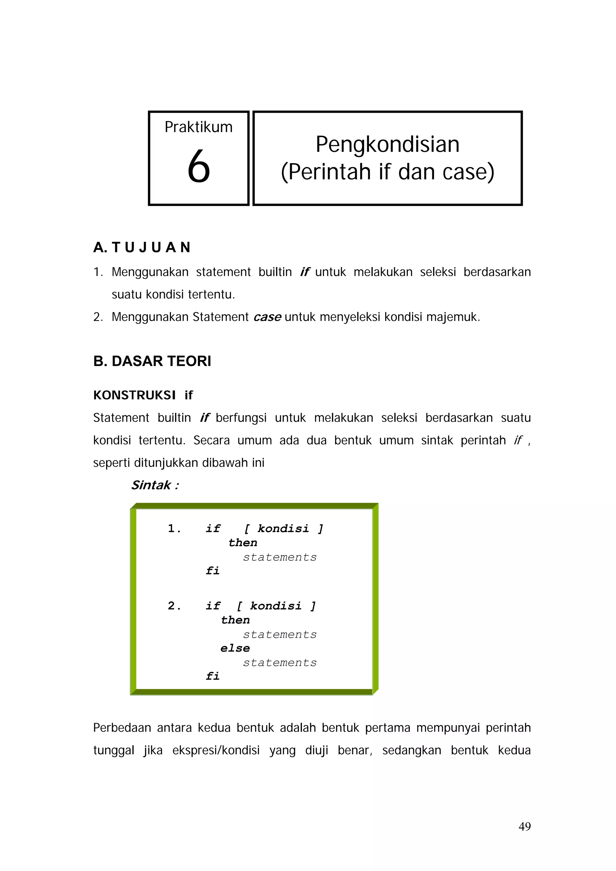 Dokumen ini membahas penggunaan pengkondisian dalam pemrograman shell Linux dengan menggunakan perintah if dan case. Dijelaskan berbagai bentuk sintaks if, cara penggunaannya untuk kontrol alur, serta contoh penggunaan case untuk menyederhanakan seleksi kondisi majemuk. Selain itu, dokumen ini juga mencakup prosedur percobaan dan latihan untuk mengimplementasikan konsep-konsep tersebut.