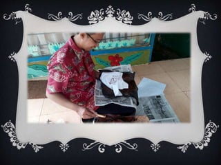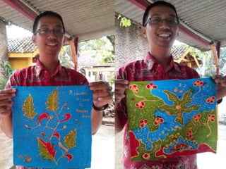Dokumen ini menjelaskan tentang batik sebagai warisan budaya Indonesia yang diakui oleh UNESCO. Batik dikelompokkan menjadi beberapa jenis berdasarkan teknik pembuatannya, seperti batik tulis, batik cap, dan batik painting, dengan proses yang melibatkan penggunaan malam untuk menciptakan motif. Proses pembuatan batik meliputi membikin pola, melukis dengan malam, pewarnaan, dan membersihkan kain dari lilin setelah mencapai hasil akhir.