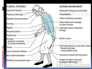 Parkinson's disease is a chronic and progressive neurodegenerative disorder characterized by motor and nonmotor dysfunction due to the loss of dopaminergic neurons in the substantia nigra. It affects roughly 1.5 million Americans, with symptoms including tremors, bradykinesia, and impaired balance, and can be classified into three types based on age of onset. Treatment options include medications like levodopa and surgical interventions such as deep brain stimulation, with nursing management focusing on symptom relief and improving quality of life.