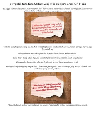 Kumpulan kata-kata mutiara memberikan pesan-pesan positif tentang hidup yang bahagia, menghargai orang tua, dan mencintai diri sendiri apa adanya. Beberapa pesan kunci adalah untuk menikmati hidup dan saat-saatnya, bersyukur atas apa yang dimiliki, serta memahami bahwa kesepian tidak selalu berarti sendirian.