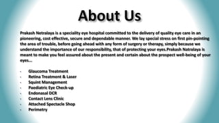 Prakash Netralaya is a specialty eye hospital in Pune, dedicated to delivering quality eye care services, including treatments for glaucoma, retina issues, squint management, and pediatric eye care. They emphasize accurate diagnosis prior to treatment and provide reliable, affordable eye check-ups, alongside advanced technology and experienced staff. The hospital operates Monday to Saturday, offering a range of eye-related services at competitive rates.