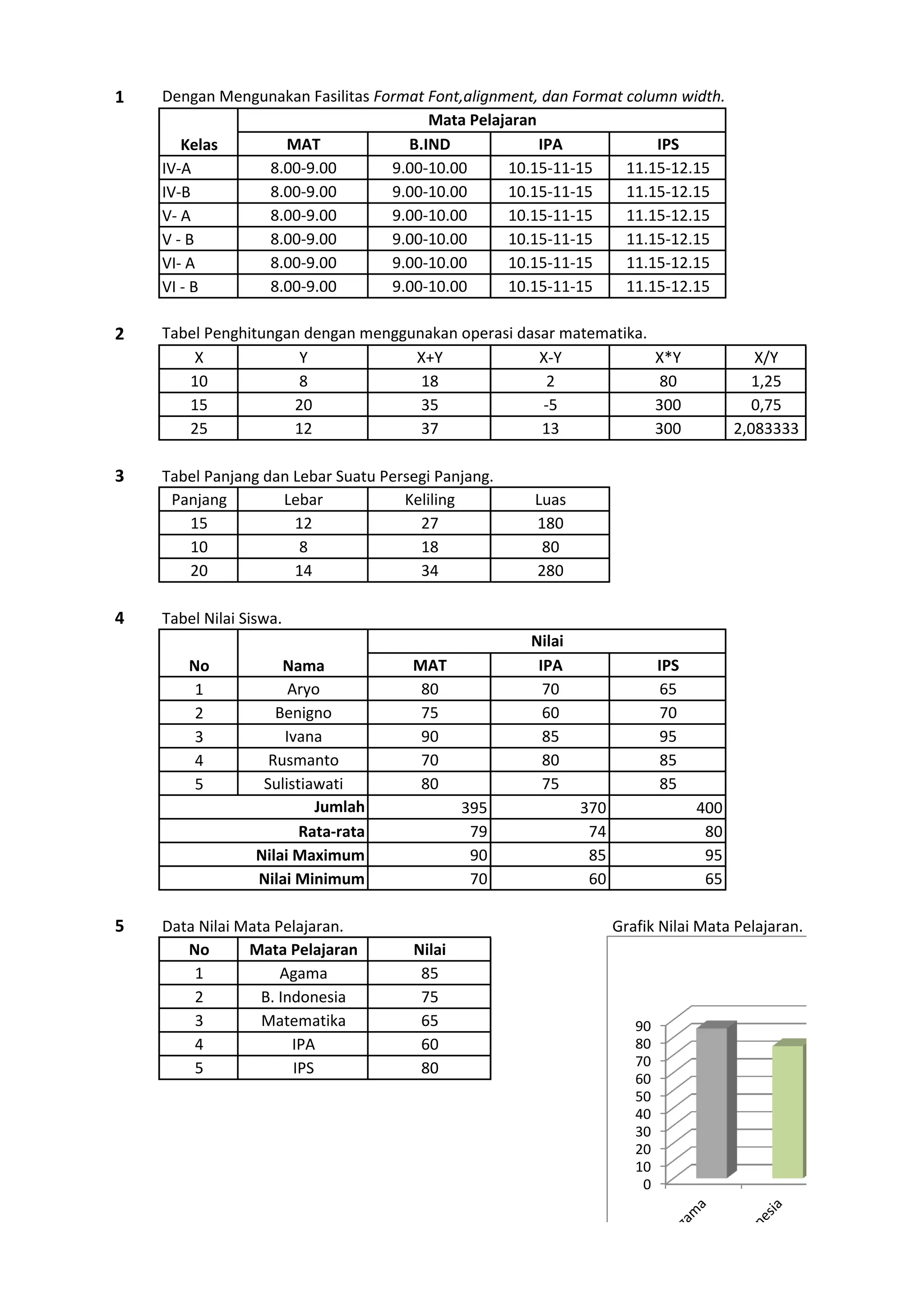 Dokumen ini berisi jadwal dan nilai siswa untuk berbagai mata pelajaran, serta tabel penghitungan matematis. Terdapat informasi tentang panjang, lebar, keliling, dan luas persegi panjang serta grafik nilai. Data tersebut disusun menggunakan format tertentu untuk kejelasan penyampaian informasi.