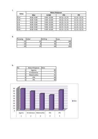 IPS IV-A 8.00- 9.00 9.00- 10.00 10.15- 11.15 11.15- 12.15 IV-B 8.00- 9.00 9.00- 10.00 10.15- 11.15 11.15- 12.15 V-A 8.00- 9.00 9.00- 10.00 10.15- 11.15 11.15- 12.15 V-B 8.00- 9.00 9.00- 10.00 10.15- 11.15 11.15- 12.15 VI-A 8.00- 9.00 9.00- 10.00 10.15- 11.15 11.15- 12.15 VI-B 8.00- 9.00 9.00- 10.00 10.15- 11.15 11.15- 12.15 3. Panjang Lebar Keliling Luas 15 12 54 180 10 8 36 80 20 14 68 280 5. No Mata Pelajaran Nilai 1 Agama 85 2 B.Indonesia 75 3 Matematika 65 4 IPA 60 5 IPS 80 Kelas Mata Pelajaran 0 10 20 30 40 50 60 70 80 90 Agama B.Indonesia Matematika IPA IPS 1 2 3 4 5 Nilai