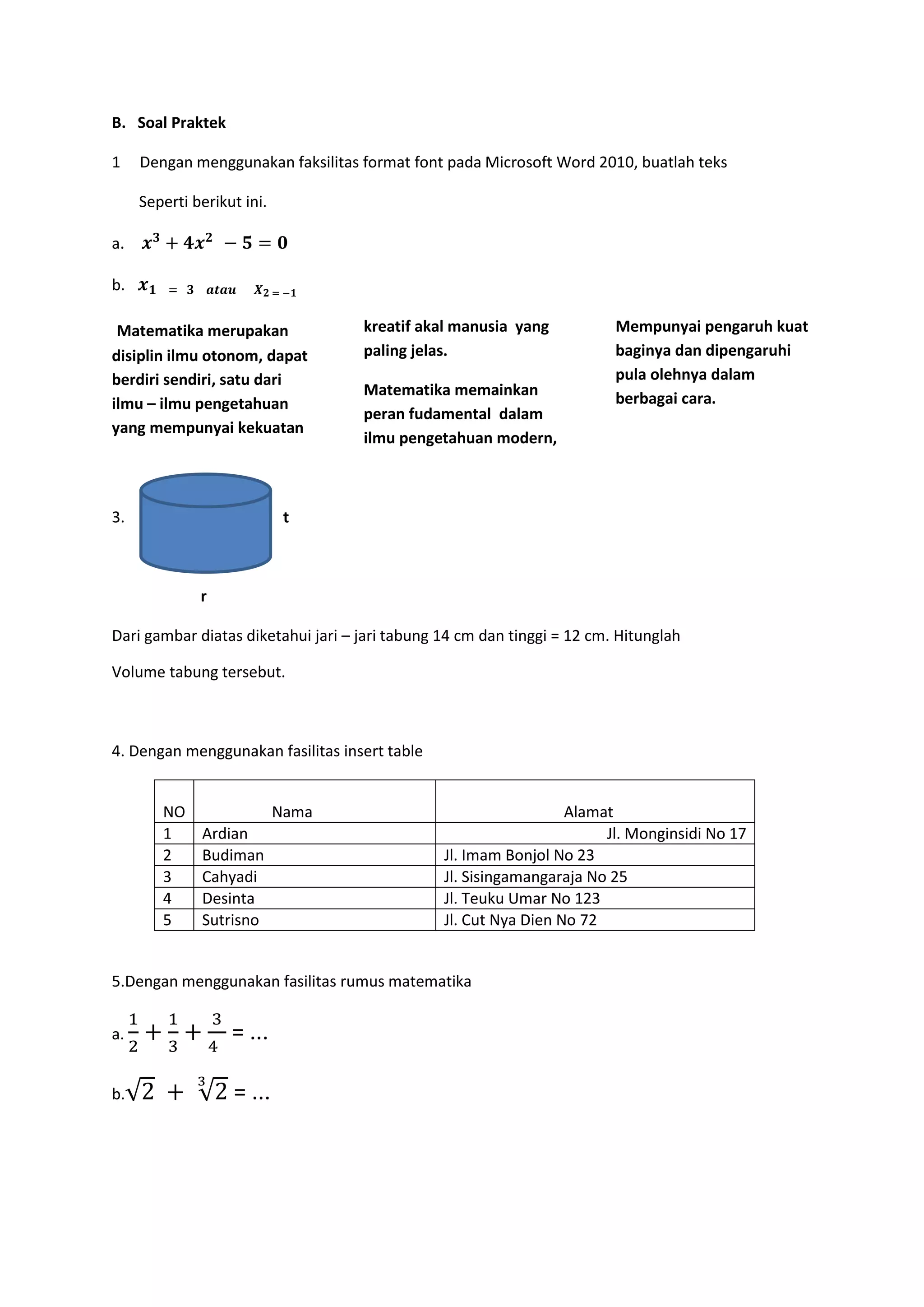 Dokumen ini memberikan instruksi praktek menggunakan Microsoft Word 2010 dan mencakup soal-soal matematika serta penghitungan volume tabung. Terdapat juga contoh tabel untuk mengorganisir data dan penggunaan rumus matematika. Matematika diidentifikasi sebagai ilmu otonom yang kreatif dan fundamental dalam perkembangan ilmu pengetahuan modern.