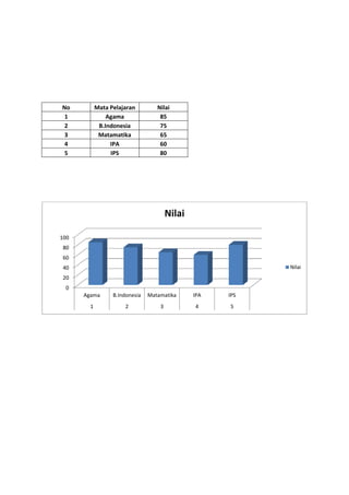 Nilai 1 Agama 85 2 B.Indonesia 75 3 Matamatika 65 4 IPA 60 5 IPS 80 0 20 40 60 80 100 Agama B.Indonesia Matamatika IPA IPS 1 2 3 4 5 Nilai Nilai