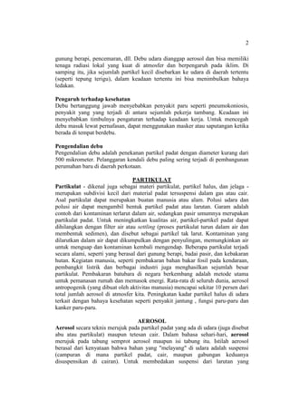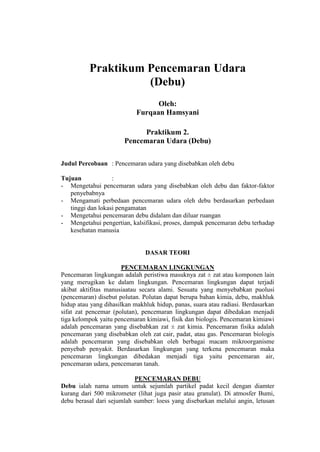 Dokumen ini membahas tentang pencemaran udara yang disebabkan oleh debu, termasuk tujuan percobaan, teori dasar, dan dampaknya terhadap kesehatan manusia. Selain itu, terdapat prosedur pengamatan dan analisis lokasi pengambilan sampel debu baik di dalam maupun di luar ruangan. Hasil menunjukkan bahwa lokasi dekat proyek konstruksi memiliki tingkat debu yang lebih tinggi, serta pentingnya pengendalian debu untuk kesehatan manusia.