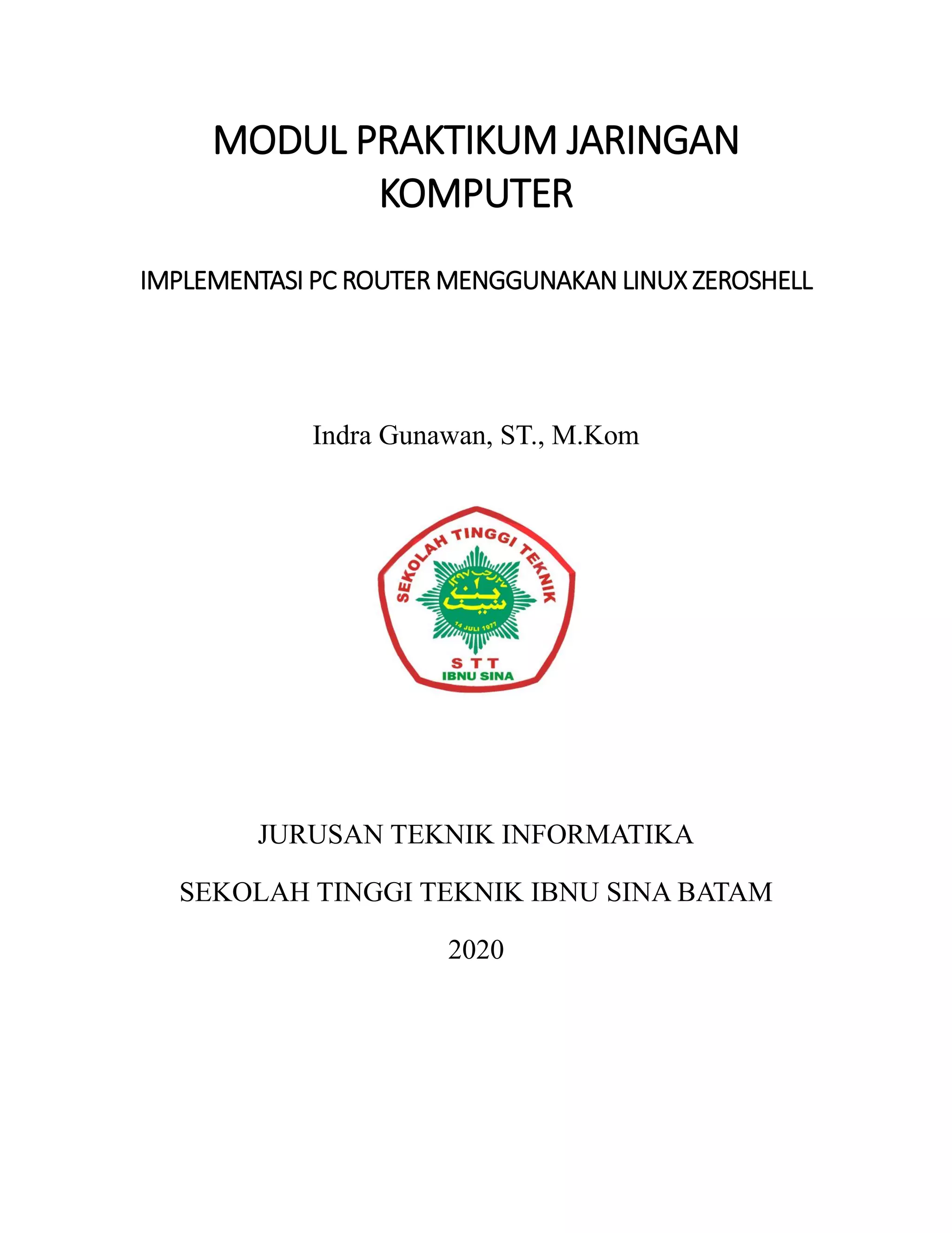 Dokumen ini merupakan modul praktikum tentang implementasi PC router menggunakan Linux Zeroshell, mencakup berbagai istilah penting dalam jaringan komputer seperti gateway, NAT, DNS, dan VPN. Juga dijelaskan langkah-langkah instalasi dan konfigurasi Zeroshell, termasuk pengaturan DHCP, SSH, captive portal, QoS, dan net balancer. Modul ini memberikan panduan praktis untuk manajemen jaringan serta keamanan menggunakan Zeroshell sebagai alternatif perangkat jaringan.