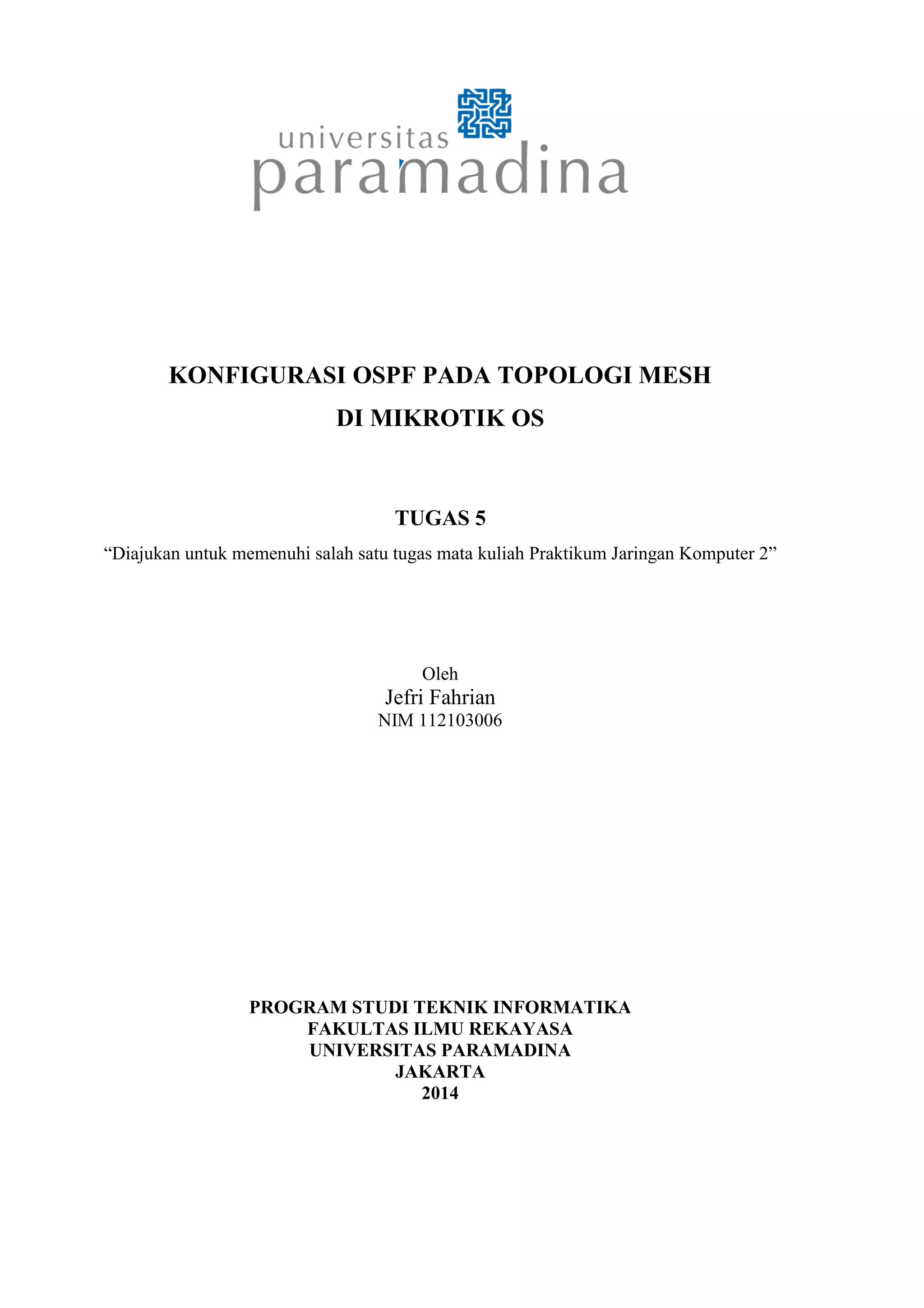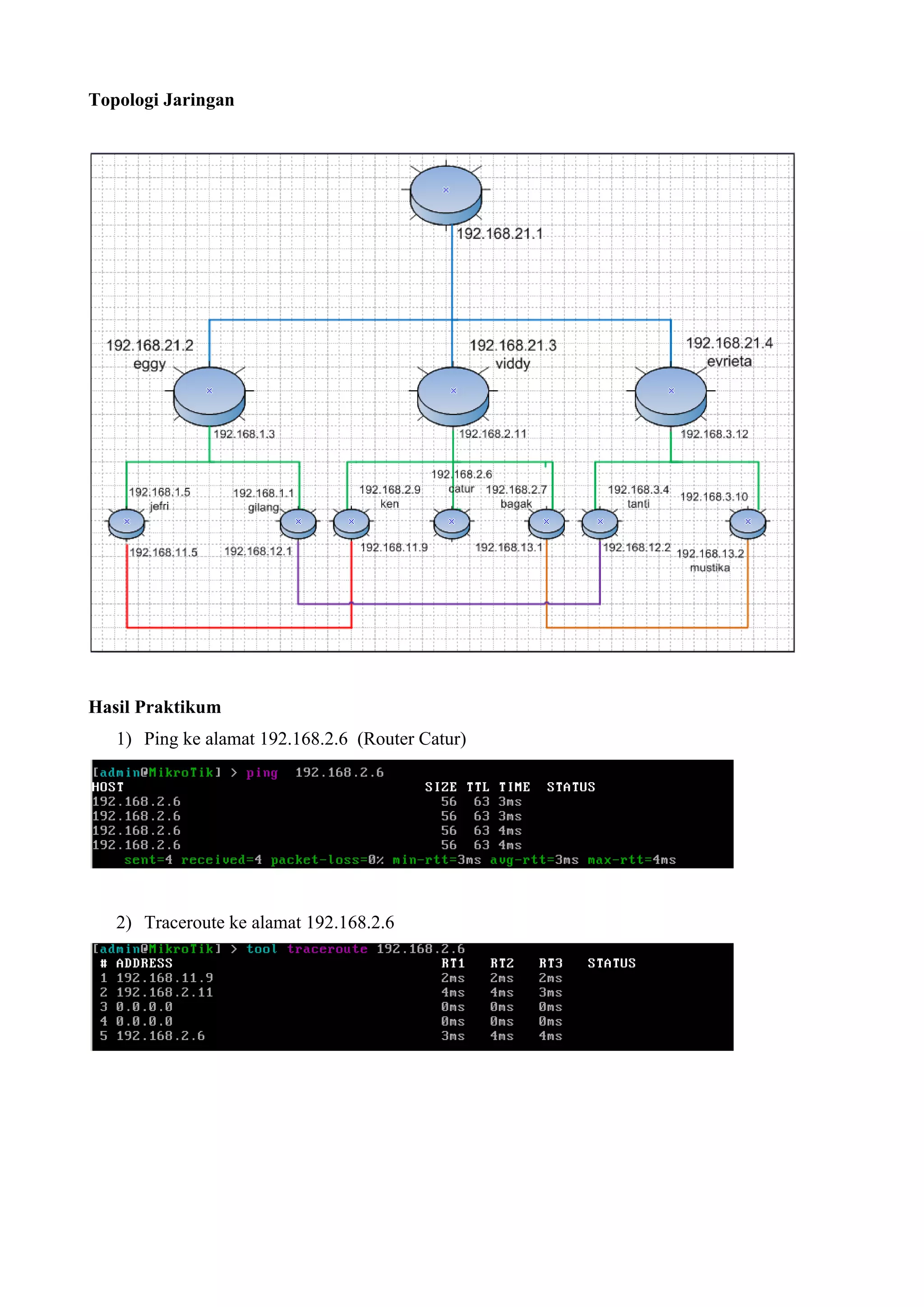 Dokumen ini membahas konfigurasi routing OSPF pada topologi jaringan mesh menggunakan Mikrotik OS. Topologi tersebut terdiri dari beberapa router yang terhubung satu sama lain dan berada pada area yang berbeda. Hasilnya, router-router tersebut dapat saling berkomunikasi meskipun berada pada area yang berbeda karena telah diadvertise nama area dan IP network masing-masing router.