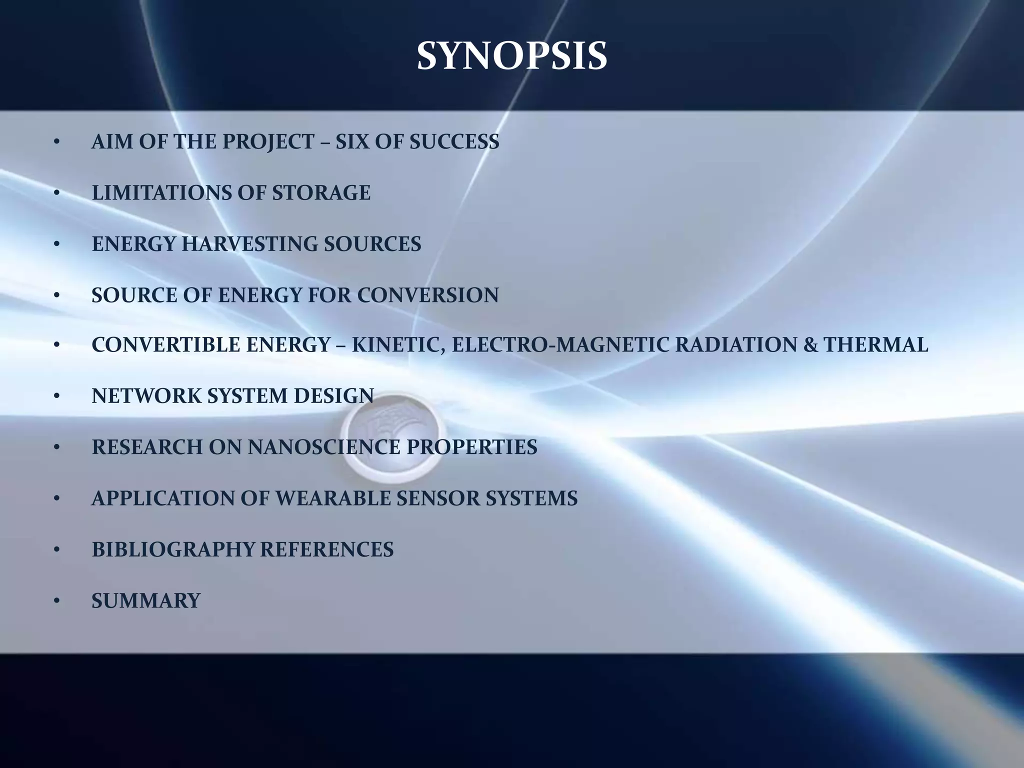 The project aims to develop energy harvesting wearable sensor systems that convert human and environmental energy into electrical energy using nano-composite structures. It addresses limitations in energy storage and focuses on capturing kinetic, thermal, and electromagnetic energy for wireless applications. The research emphasizes the integration of low-power technologies with advanced network systems and nanoscience principles to create efficient, self-sustaining energy solutions.