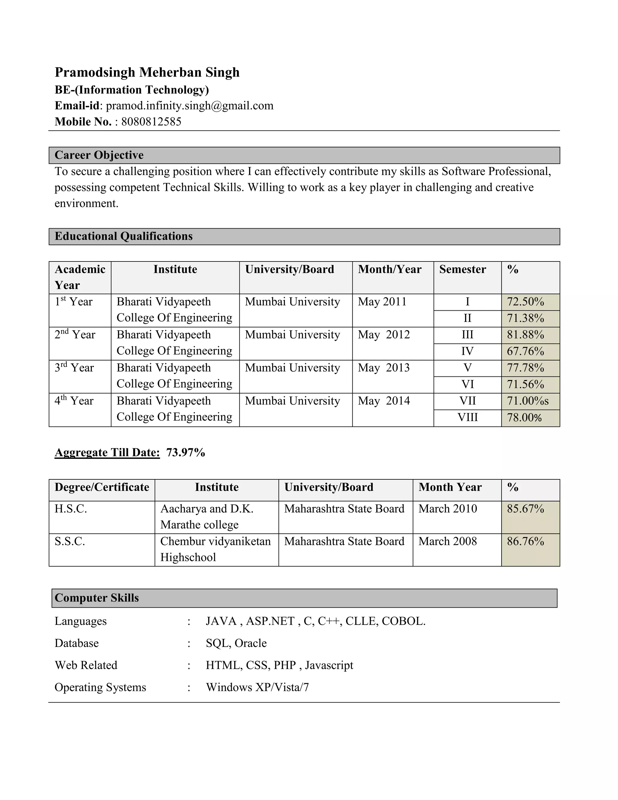 Pramodsingh Meherban Singh is seeking a challenging position as a software professional. He has a Bachelor's degree in Information Technology from Bharati Vidyapeeth College of Engineering in Mumbai University with an aggregate score of 73.97%. His skills include languages like Java, ASP.NET, C, C++, and databases like SQL and Oracle. He has received several awards for his academic and project achievements and his hobbies include reading and playing cricket.