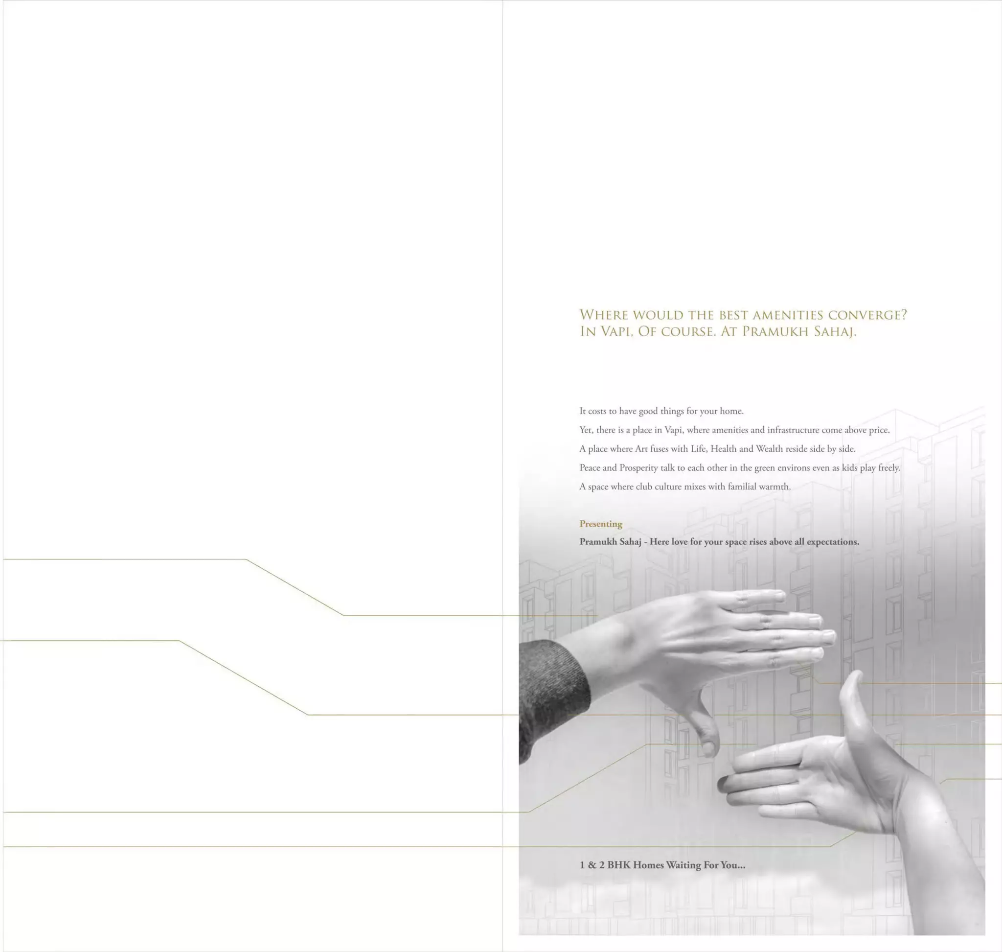 7 PHENOMENAL TOWERS OFFERING 560 TRANQUIL HOMES OF 1 AND 2 BHK SPRAWLED ACROSS 5.4 LAC SQ. FT. OF CONSTRUCTION AREA Experience the serenity of living amidst nature’s glorious greens. The peacefulness and grandeur of these homes will take your love for your space beyond all expectations. Lay your head back and let your ears relish the honey-like sweet sound of water gushing from the cascade. Welcome to Pramukh Sahaj where luxury will become a habit and spending quality time with your family even more special.
