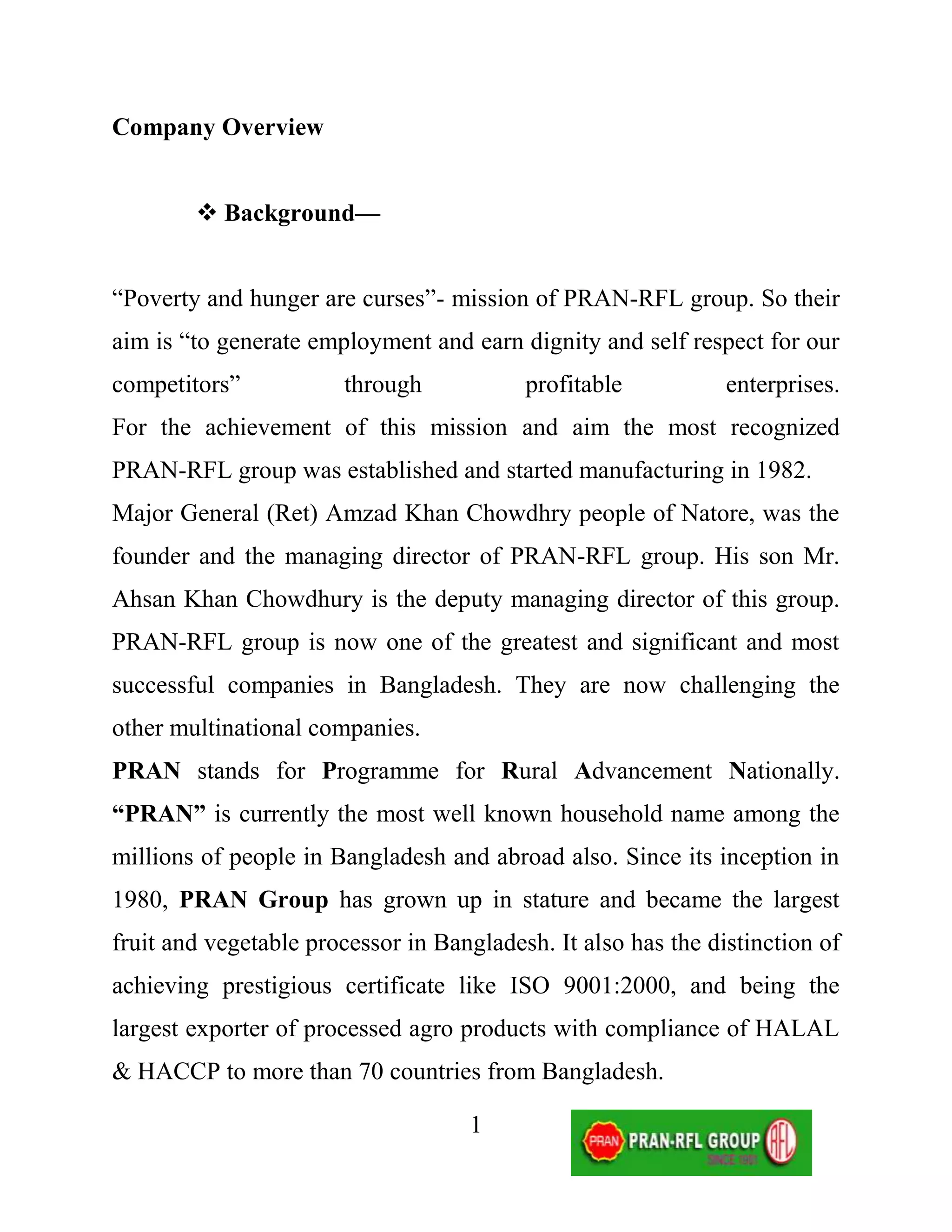 PRAN-RFL Group is a large food and beverage processing and plastic manufacturing company in Bangladesh. It was founded in 1982 with the mission of reducing poverty and hunger through profitable enterprises. PRAN-RFL Group now has 17 associated companies producing juices, dairy products, biscuits, confectionaries, plastics, and other items. It is one of the largest exporters of processed agricultural products from Bangladesh. The company aims to expand its international brand recognition and presence globally. PRAN-RFL Group utilizes various marketing strategies including line extensions, brand extensions, and multi-brands to develop its portfolio of products and brands. It conducts SWOT and competitive analysis to strengthen its market position.