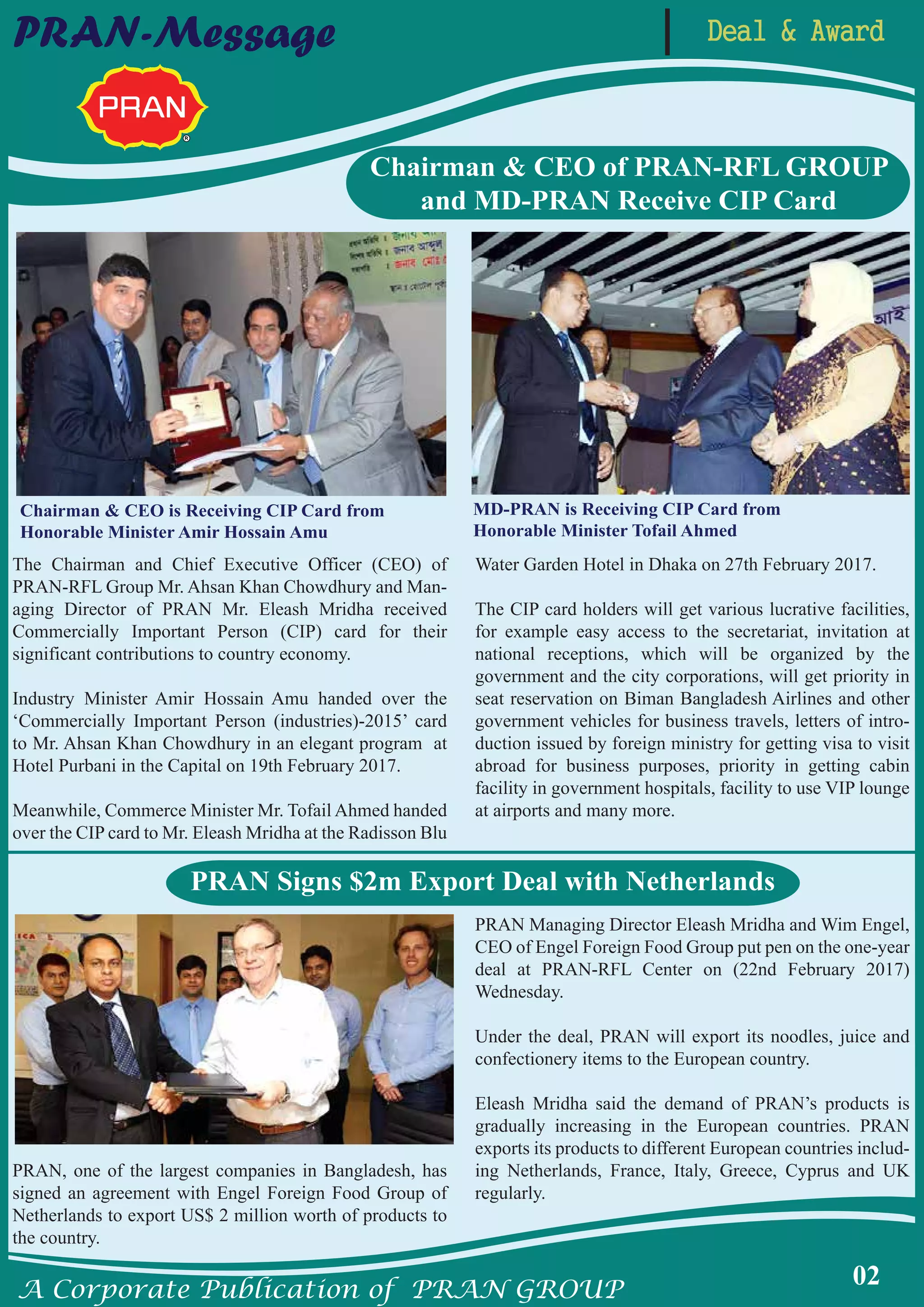 The document provides information about various deals, awards, and activities of PRAN Group companies. It mentions that the Chairman and CEO of PRAN-RFL Group and Managing Director of PRAN received Commercially Important Person awards from government ministers for their contributions to the economy. It also discusses PRAN signing a $2 million export deal with a company in Netherlands and Tasty Treat winning an award at the Dhaka International Trade Fair. Further, it provides details about various PRAN companies' participation in international trade fairs and exhibitions in countries like Germany, USA, and France.