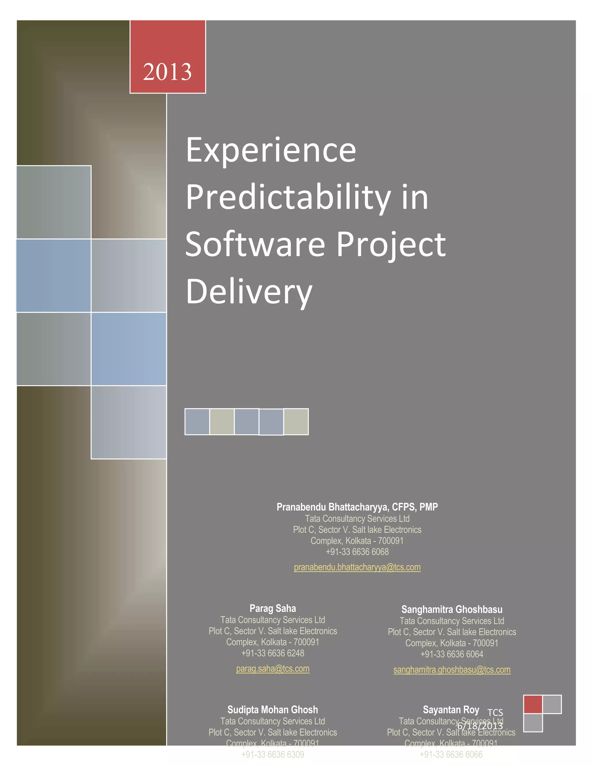 This document describes an estimation framework developed by Tata Consultancy Services to standardize and improve the accuracy of software project estimations. The framework includes components for sizing, effort estimation, scheduling, resource planning, and costing. It also includes a decision matrix to select the appropriate estimation model based on project characteristics. Continuous feedback from project outcomes is used to refine the framework over time through a plan-do-check-act cycle. The framework aims to increase predictability and reduce risks associated with inaccurate project estimations. A case study demonstrates how the framework was applied to a sample project.