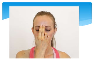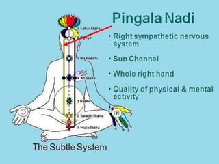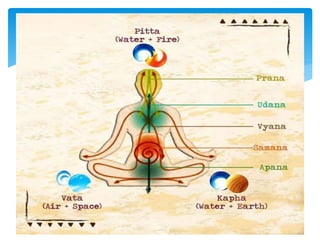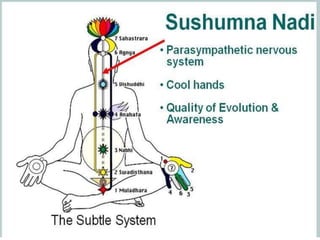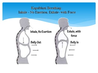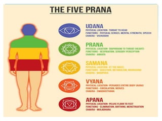 This document provides guidelines for practicing pranayama or breathing exercises. It describes proper locations and times for practice. It also explains important concepts like the five types of prana or life force (prana, apana, vyana, udana, samana) and the three major nadis or energy channels (ida, pingala, sushumna). Specific techniques are outlined for foundational pranayamas like anulom vilom, kapalbhati, and ujjayi. Benefits include purification of the subtle body and curing diseases. Precautions are mentioned for certain individuals.