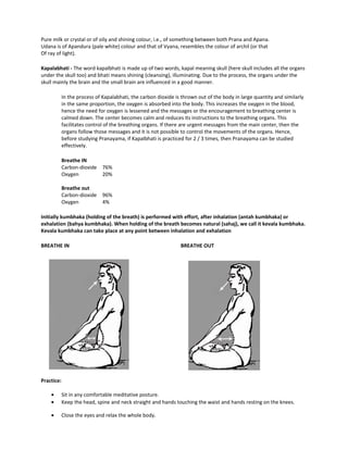Pranayama involves breathing techniques that aim to distribute energy throughout the body. It uses inhalation, exhalation, and breath retention. Specific techniques include abdominal breathing, thoracic breathing, clavicular breathing, and nostril breathing. Pranayama has physical and mental health benefits like reducing stress, improving lung capacity, and increasing memory. Precise hand positions called mudras are used along with breathing to target different areas of the body or energy channels.