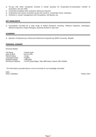 Pranay Joshi is a technical recruiter with 1 year of experience at Collabera Technologies Pvt Ltd. He has a bachelor's degree in electrical and electronics engineering. His skills include recruiting software engineers, developers, and other technical roles. He is proficient in full life cycle recruiting including sourcing candidates, screening, interviewing, negotiating offers, and ensuring consultant satisfaction. He has successfully recruited for a wide range of technical roles in the past year.