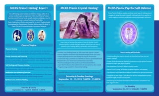 The document advertises an intensive weekend workshop teaching Pranic Healing, Pranic Crystal Healing, and Pranic Psychic Self Defense. The workshop will be held September 12-14 in Sunnyvale, CA and taught by Master Stephen Co. Attendees will learn techniques to harness life force energy to relieve pain and heal physical or emotional ailments, enhance healing with crystals, and protect against psychic attacks. Pranic Healing uses no-touch techniques to heal through projected life force energy.
