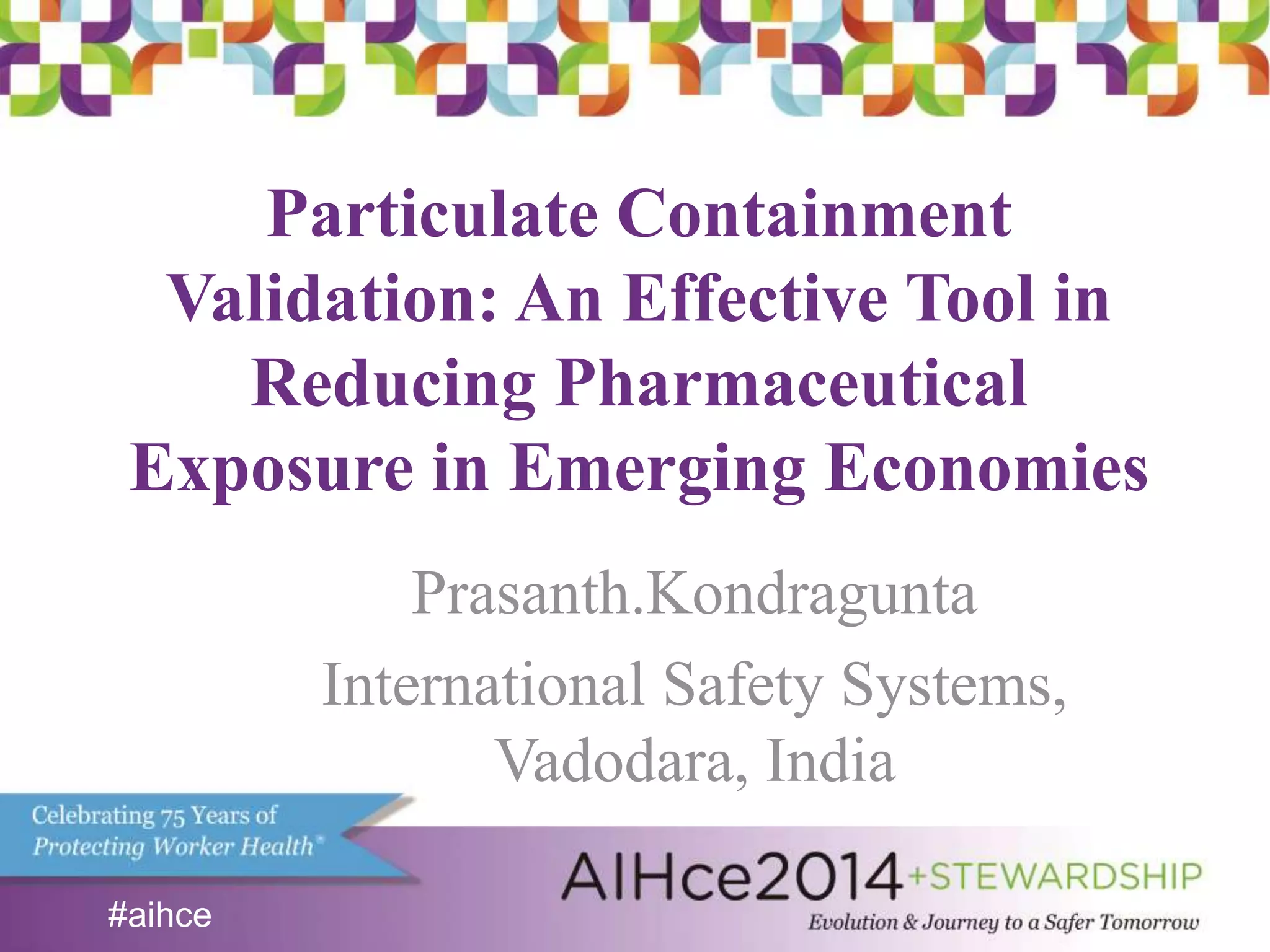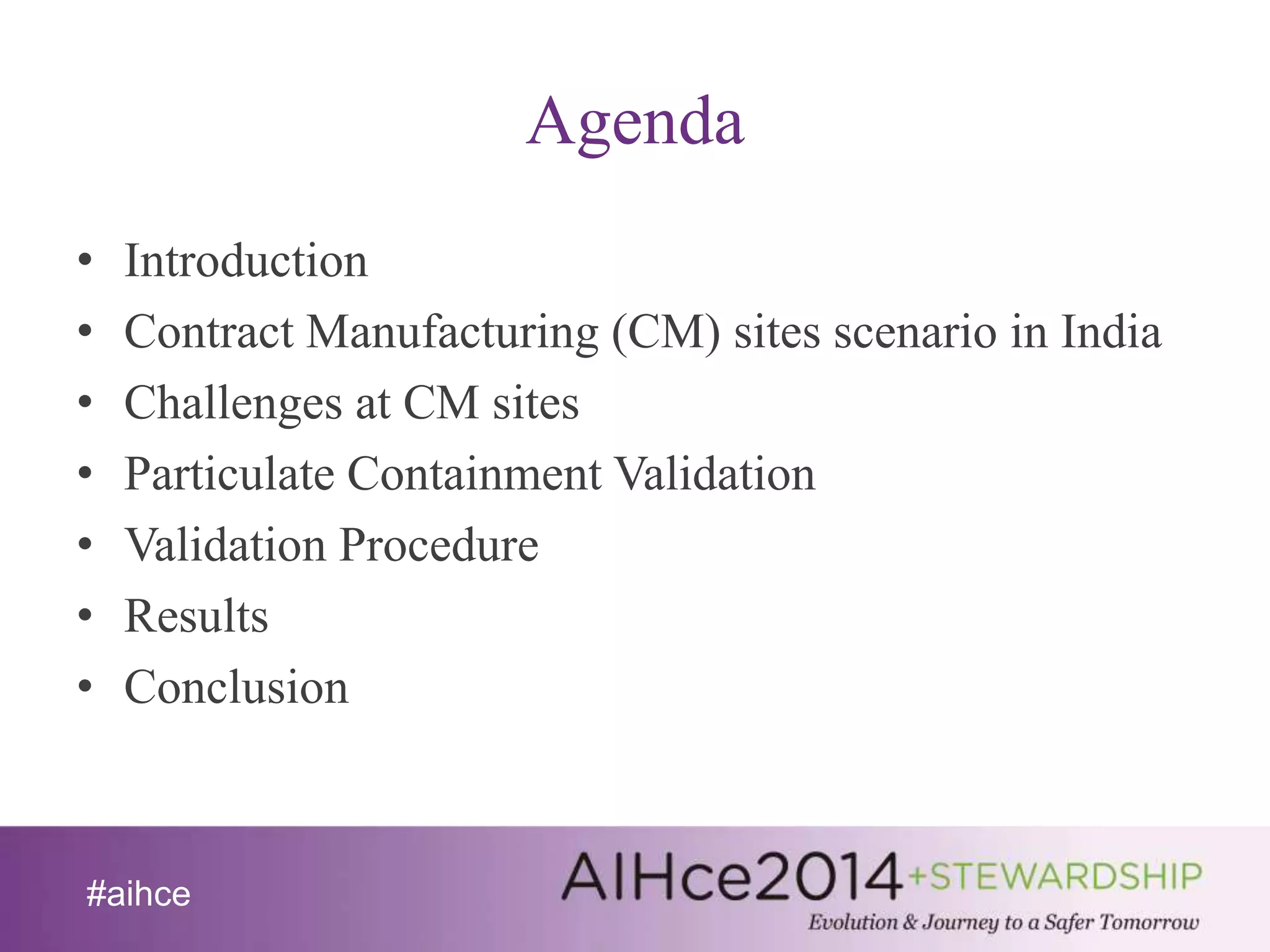 The document discusses the significance of particulate containment validation in reducing pharmaceutical exposure, particularly in India's rapidly growing contract manufacturing sector. It highlights challenges such as inadequate risk assessment, lack of occupational exposure limits, and insufficient analytical methods, while presenting a validation procedure that involved monitoring four isolators. Results showed that exposure levels were mostly below the containment performance target, but surface contamination exceeded thresholds, leading to key recommendations for improving containment practices.