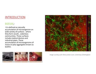 Biofilm formation involves the accumulation of microorganisms on surfaces where they form sessile communities encased in an extracellular polymeric substance matrix. Biofilm formation progresses through initial attachment, irreversible attachment aided by EPS production, early development, maturation, and dispersion. Virulence factors and quorum sensing play important roles in biofilm formation. Mature biofilms pose challenges for antibiotic treatment and are implicated in various pathogenic conditions like cystic fibrosis, periodontitis, and device-related infections. Therapeutic strategies aim to target biofilm formation, virulence factors, and quorum sensing.