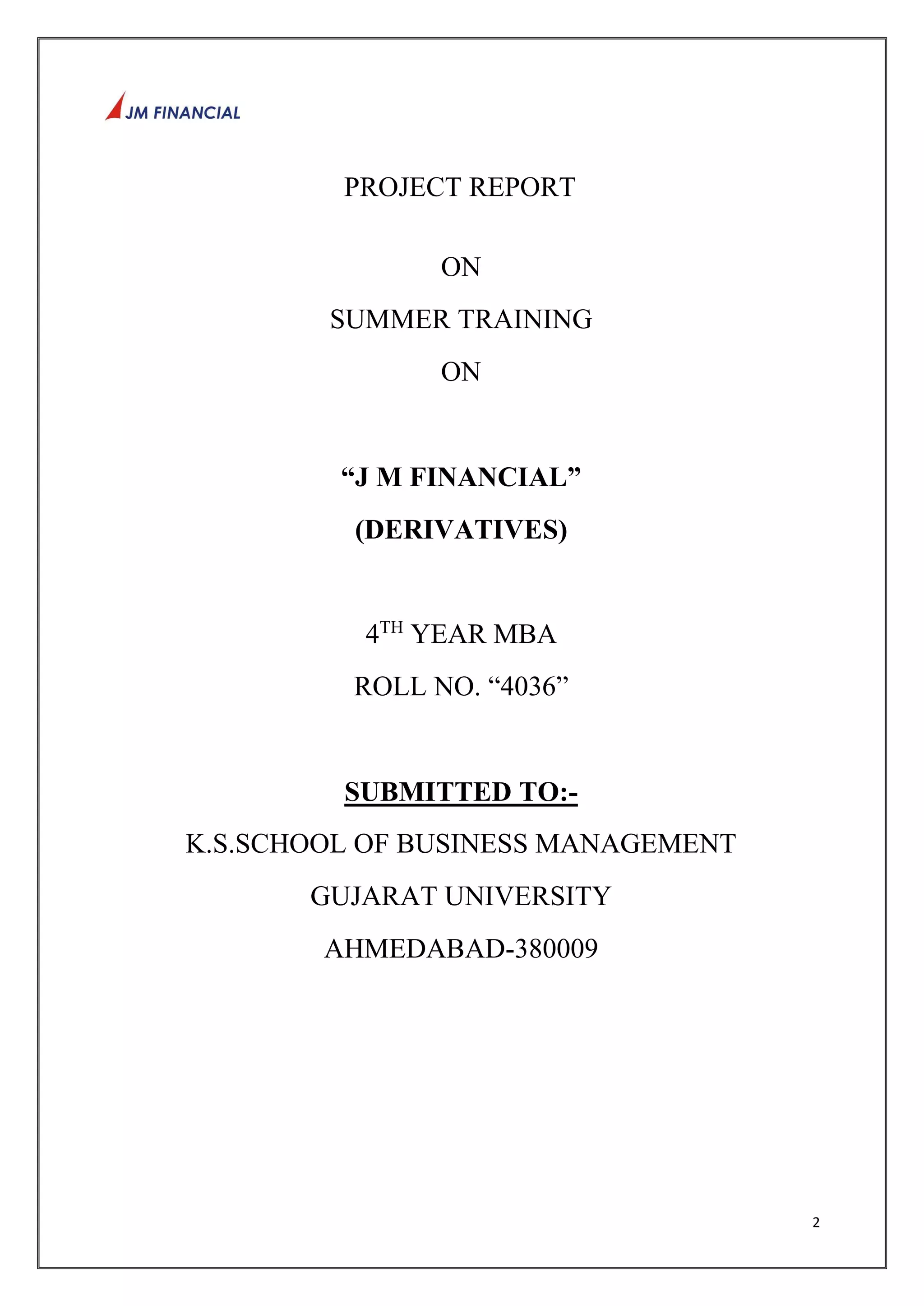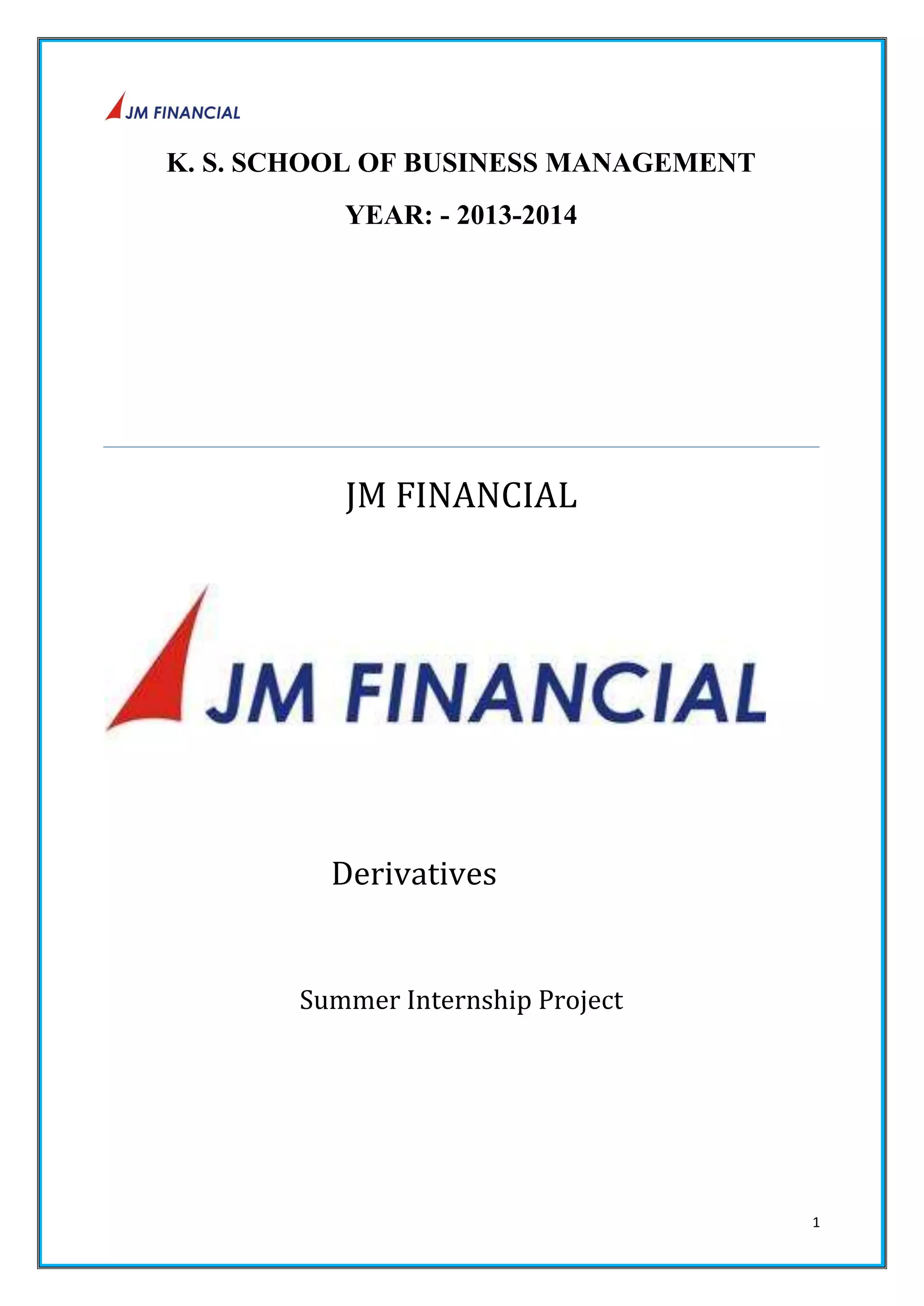 This document is a project report submitted as part of an internship at JM Financial in their Derivatives division. It includes an overview of JM Financial, including their history, vision, values, and the services they provide. It also provides a high-level overview of the financial markets, including the primary market, secondary market, and derivatives segment. The report focuses on derivatives, including the origins and development of derivatives in India, as well as definitions and explanations of different derivative products like forwards, futures, and options contracts.