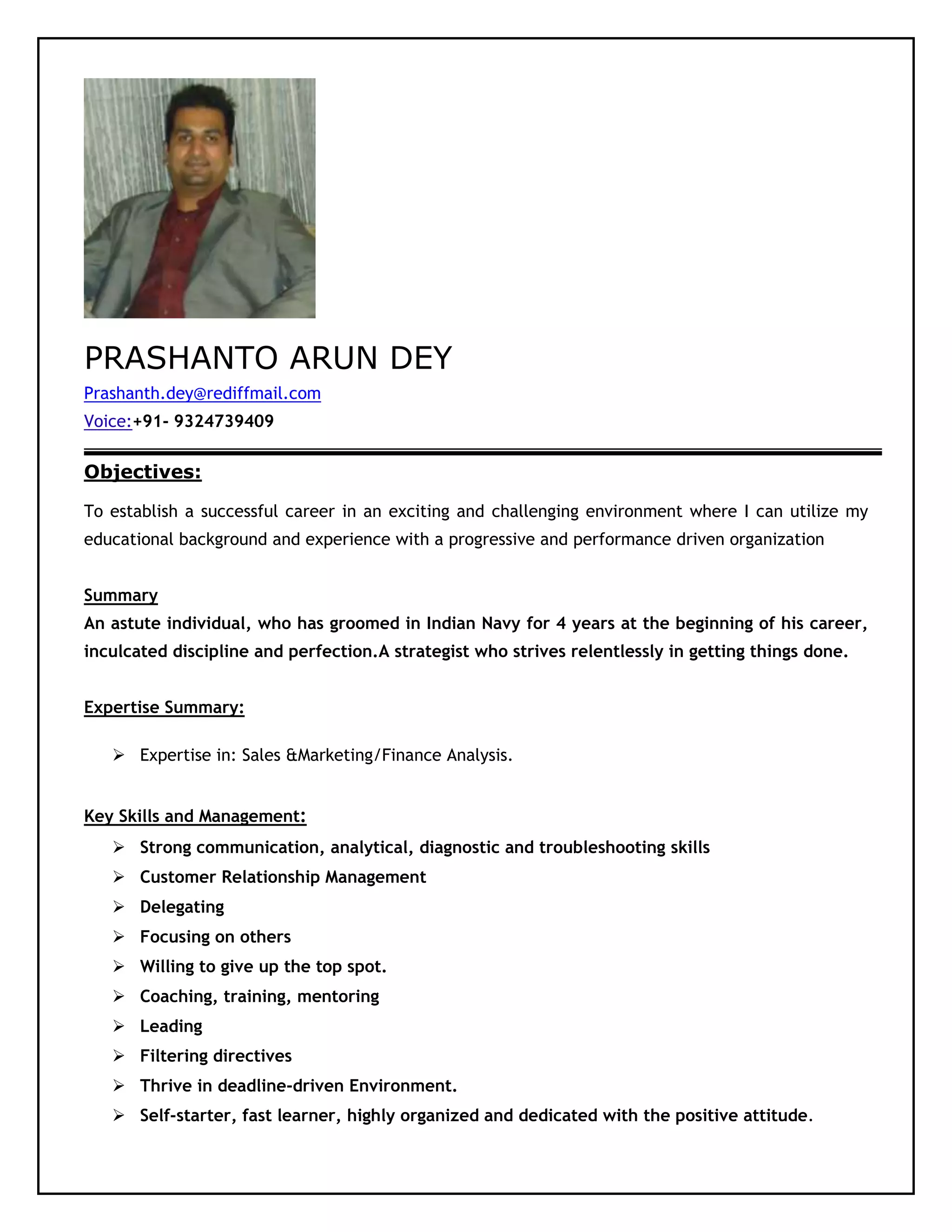 Prashanto Arun Dey is a sales and marketing professional with over 10 years of experience in real estate. He has held roles such as Senior Manager, General Manager, and City Head of Sales and Marketing. Dey aims to utilize his educational background in business and experience in sales, marketing, and relationship management to establish a successful career in a progressive organization.
