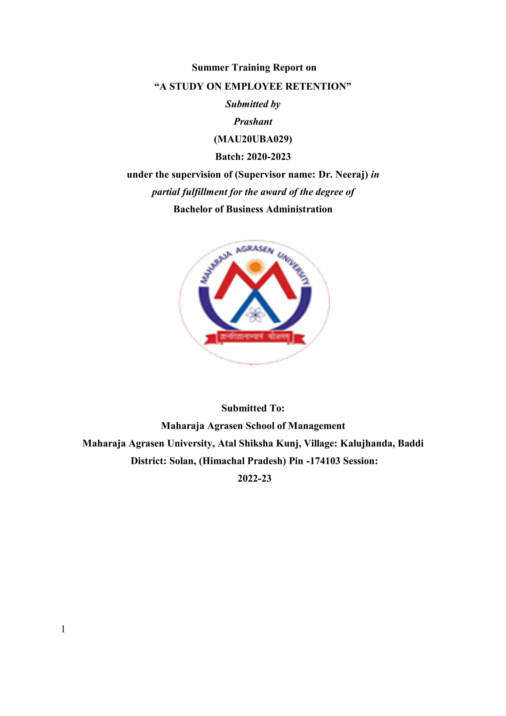 The document is a summer training report submitted by Prashant to study employee retention at Sarvotham Care, a pharmaceutical company in India. It provides background on the pharmaceutical industry and company in India, outlines the objectives and scope of the project to study employee retention, and declares the report as an original work conducted under supervision.