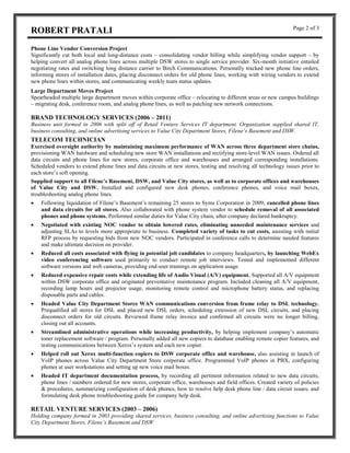 Robert Pratali has over 20 years of experience in telecommunications and technical project management for large retailers. He has expertise in areas such as network management, hardware/software configuration, technical support, and PBX administration. Throughout his career, he has helped open up to 45 new store locations annually, rolled out VoIP phone systems, and improved network performance while reducing costs. His experience includes positions at DSW, Brand Technology Services, and Retail Venture Services, where he was responsible for telecom operations, technical support, and various telecom projects.