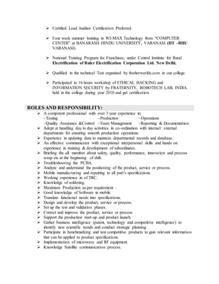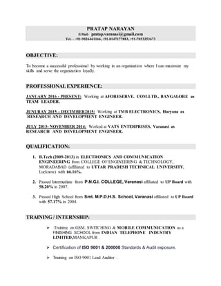 Pratap Narayan is seeking a position that allows him to maximize his skills and serve an organization loyally. He has over 3 years of experience in testing, production, quality assurance, and team management. He is currently working as a team leader at AFORESERVE.COM.LTD. in Bangalore. Previously he held research and development roles at two other companies. Pratap has a Bachelor's degree in electronics and communication engineering and specialized training in areas like mobile communication, auditing, and information security. He has strong communication, problem-solving, and technical skills.