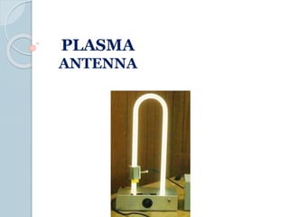 Plasma is the fourth state of matter where a gas is ionized by adding heat or energy. A plasma antenna uses ionized gas enclosed in a tube or enclosure as the conducting element, replacing a solid conductor. When voltage is applied, electric and magnetic fields are emitted that propagate the signal. Plasma antennas have advantages like tunability, invisibility when off, high gain, wide bandwidth, compact size, and short pulse capability making them useful for applications like radar, communications, and stealth technology.