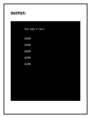 The document contains multiple C++ programs that demonstrate basic operations: displaying a message a specified number of times, calculating a value based on input parameters, and computing simple interest. Each program prompts the user for input values, performs the calculation, and outputs the result. Overall, the document illustrates fundamental programming concepts and user interaction in C++.