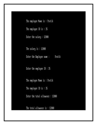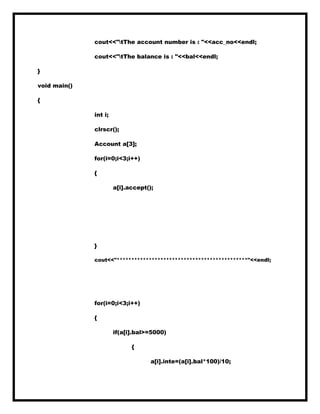 The document contains multiple C++ program examples showcasing various object-oriented programming concepts, including class definitions, data members, and member functions. It demonstrates operations such as accepting user input for account balances, calculating interest, sorting city populations, and implementing inheritance. The programs employ features like friend functions, pointers, and multiple inheritance to demonstrate practical applications of these concepts.