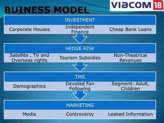 The document discusses business metrics and a comparative analysis of the movies Dabangg and Golmaal I and II including their investments, marketing costs, box office revenues, screen counts, ratings, running weeks in theaters, target categories, distributor collections, theater occupancies, and satellite and music rights deals. It provides details on the investments, revenues, profits, and performance of the two films across various business metrics to analyze their relative successes.