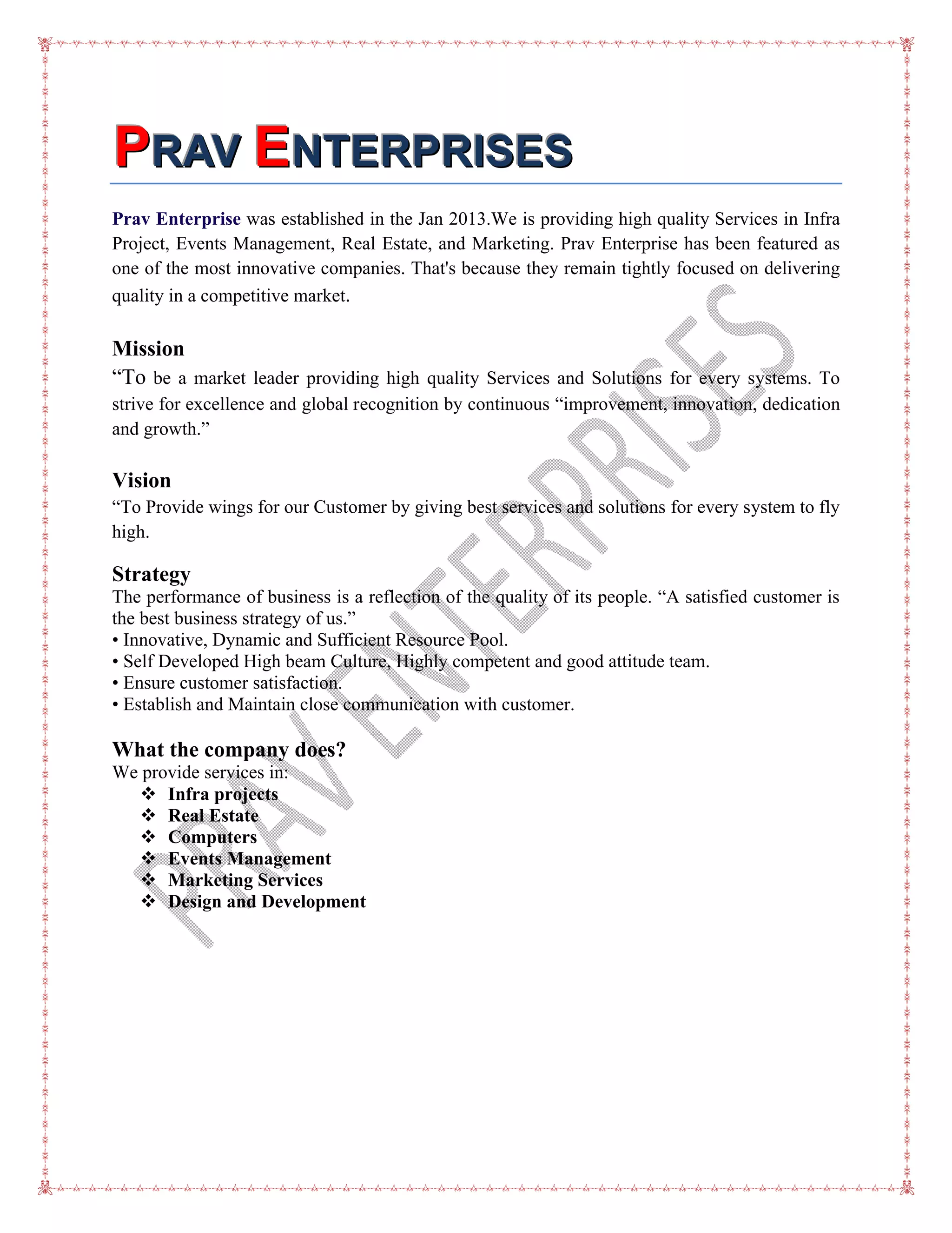 Prav Enterprises, established in January 2013, offers high-quality services in infrastructure projects, events management, real estate, and marketing, positioning itself as an innovative company. The mission emphasizes market leadership and customer satisfaction through continuous improvement, while the vision aims to empower clients by providing top-notch services. The company specializes in various sectors including infrastructure construction, IT solutions, event planning, and design services, maintaining a client-focused approach throughout its operations.