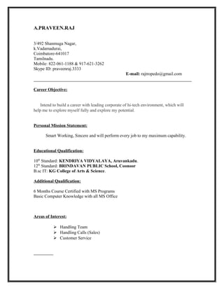 A.Praveen.Raj is seeking a career in a hi-tech environment that allows him to fully utilize his potential. He has over 8 years of experience in customer service and sales roles, including working as a senior telesales executive and team leader. Praveen has strong communication and leadership skills and strives to perform every task to his maximum capability.
