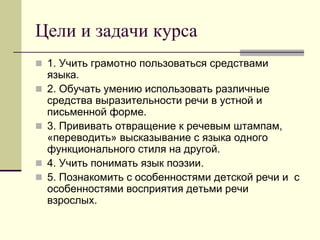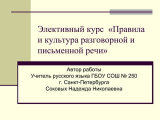 Документ описывает элективный курс по правилам и культуре разговорной и письменной речи, ставя перед собой цели обучения грамотному использованию языка и развивая навыки выразительности в устной и письменной форме. Курс включает задачи по анализу речи, пониманию языка поэзии, работе с различными типами словарей и устранению недостатков в речевой практике. Обсуждаются важные аспекты, такие как уместность речи и обучение альтернативным стилям выражения.