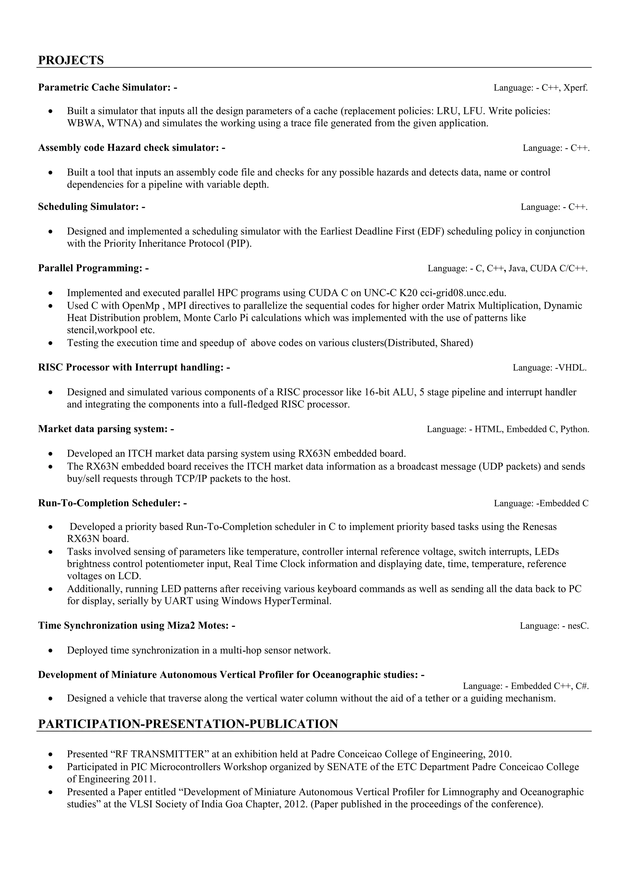 Prayat Hegde is a graduate with a Master of Science in Electrical and Electronics Engineering from the University of North Carolina at Charlotte and a Bachelor of Engineering from the University of Goa. He has worked as a graphics software engineer intern at Intel and a graduate apprentice engineer at Siemens, with a strong skill set in programming languages and software development tools. His projects include developing simulators, a market data parsing system, and a miniature autonomous vertical profiler for oceanographic studies.