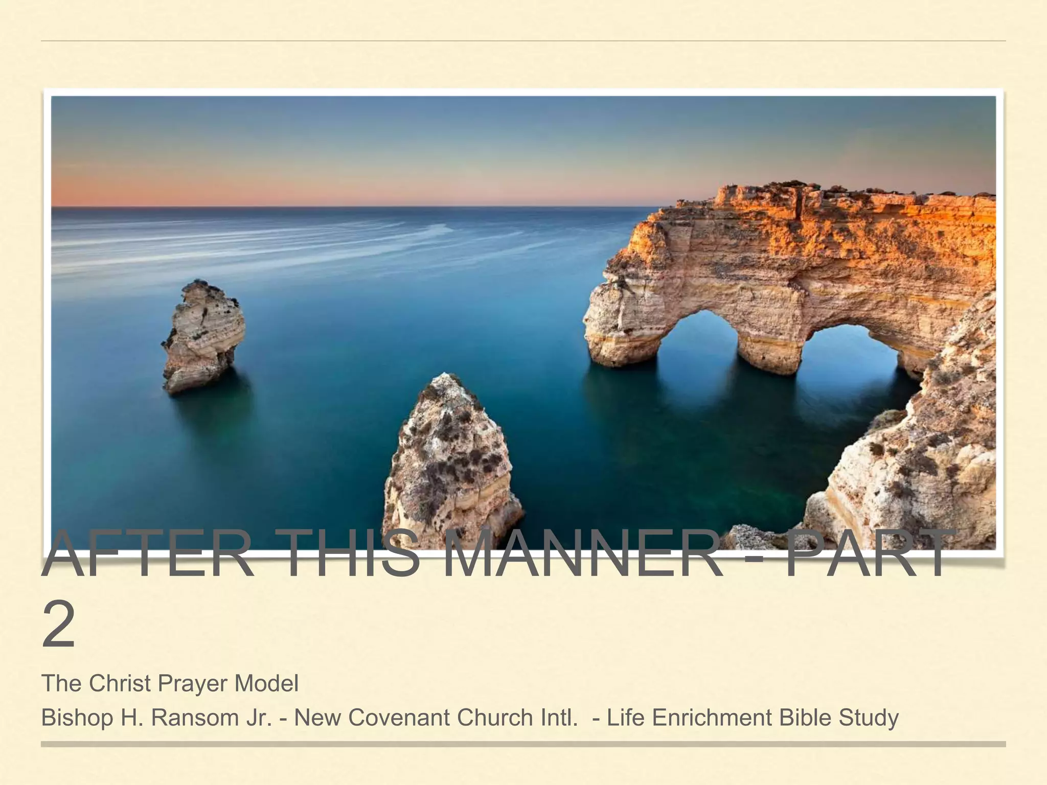This document discusses the model of the Lord's Prayer and provides commentary on each phrase. It explains that invoking God's name brings authority and represents who He is. We are called to sanctify, lift up, and magnify God's name. It also discusses praying for God's kingdom to come through binding and loosing, interceding for leaders, communities, and souls. The final phrase about God's will being done relates to aligning our will with God's kingdom purposes on earth and in our hearts.