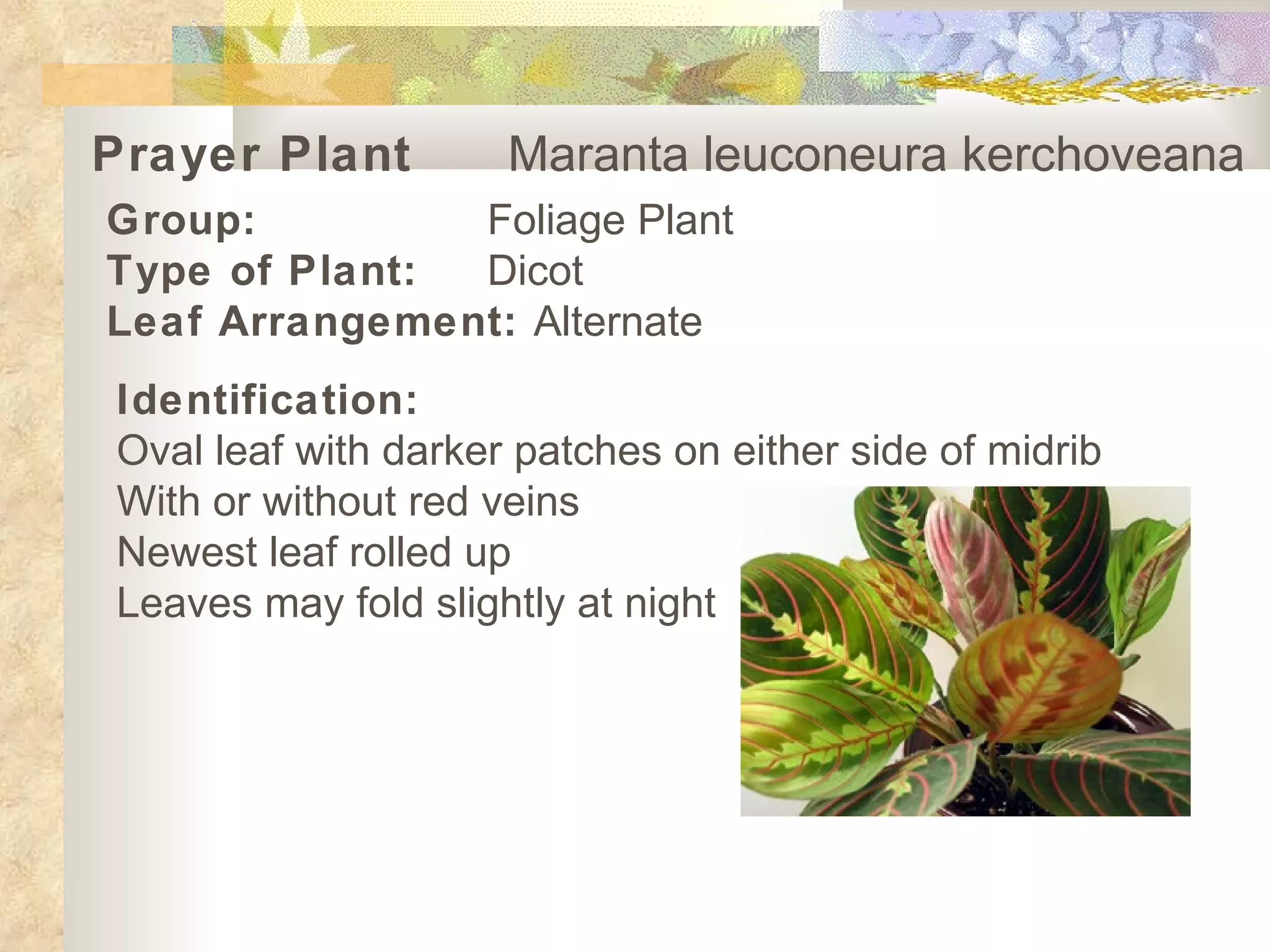 The Prayer Plant is a foliage dicot with oval leaves that have darker patches on either side of the midrib, and sometimes red veins. The newest leaf is rolled up and leaves may fold slightly at night. It likes medium light and to be kept warm and moist, almost like an African Violet. Potential problems include brown tips if too dry, rotting if too wet, and spider mites.