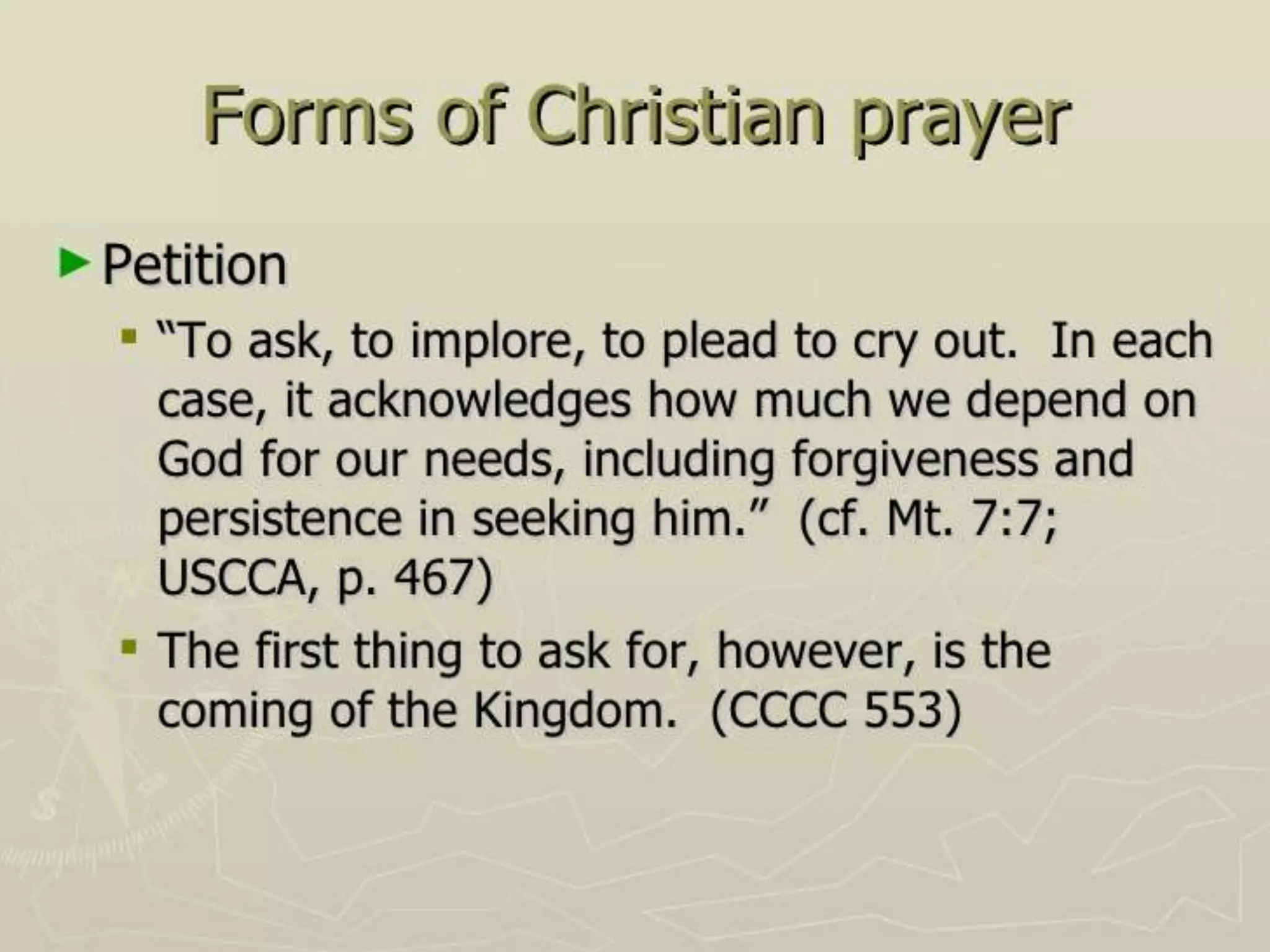 - Petition prayers request things for ourselves, like asking for forgiveness.