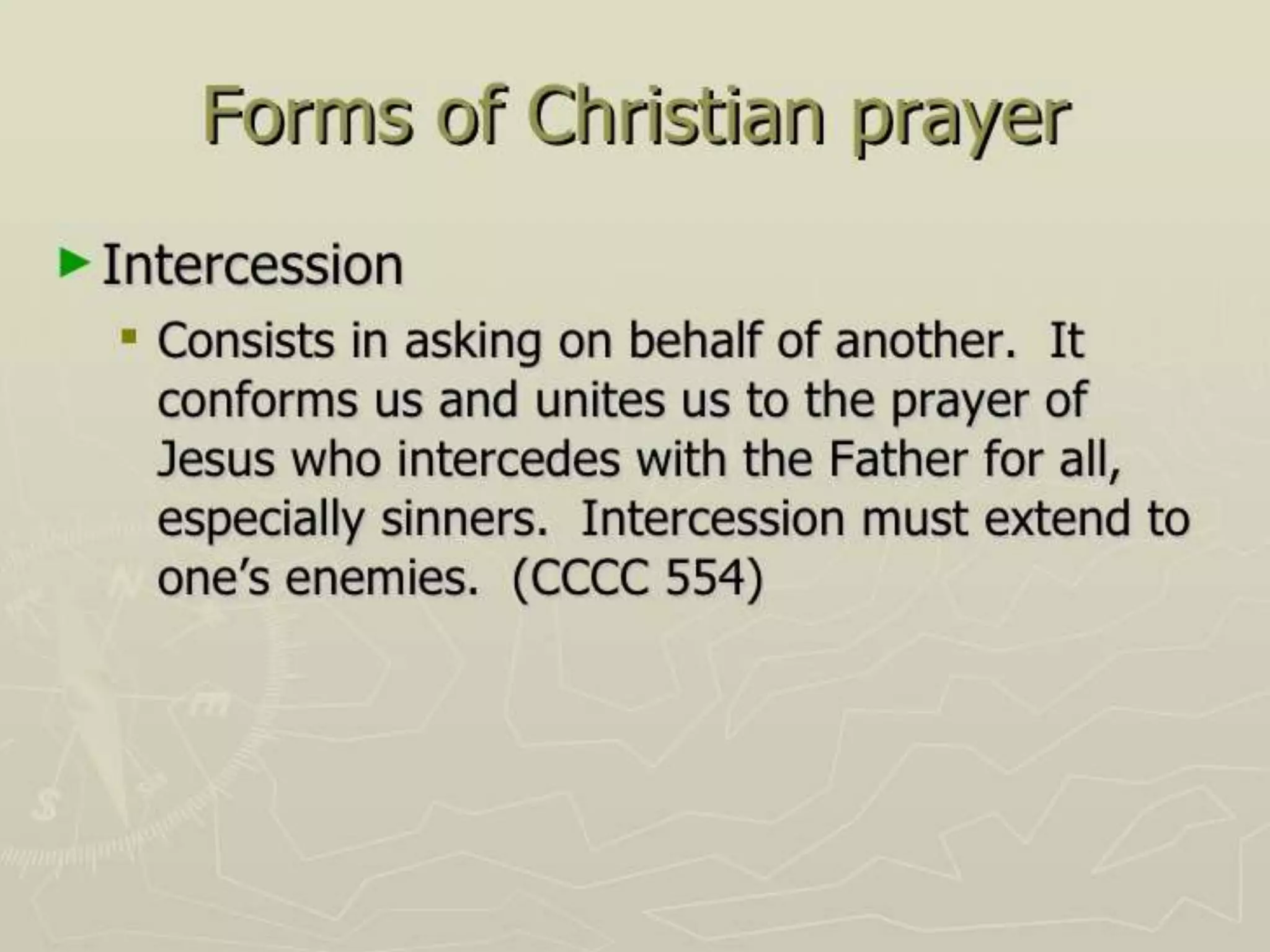 - Intercession prayers are for other people, like general intercession prayers at Mass.