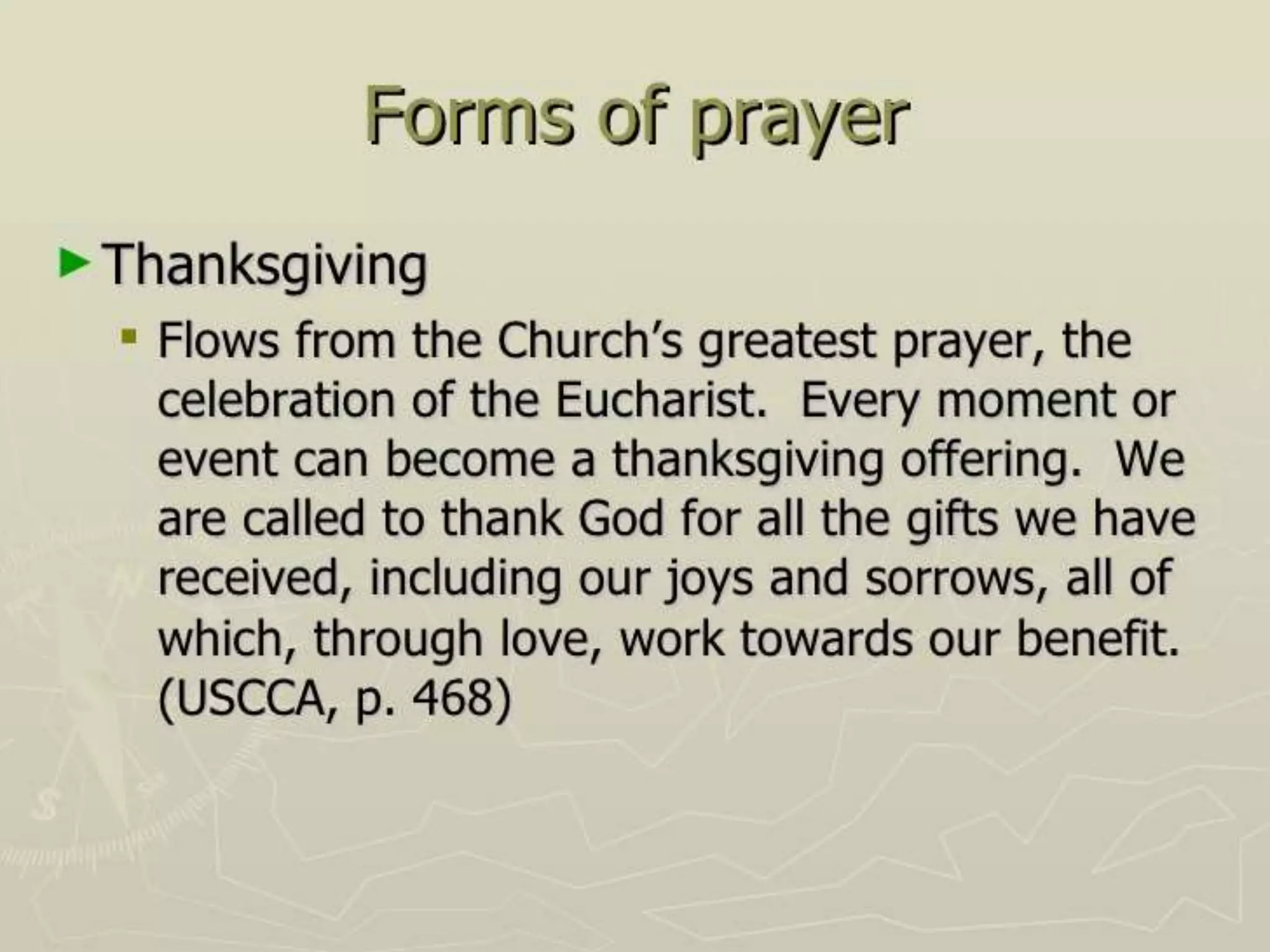 - Thanksgiving prayers acknowledge God's gifts with gratitude.