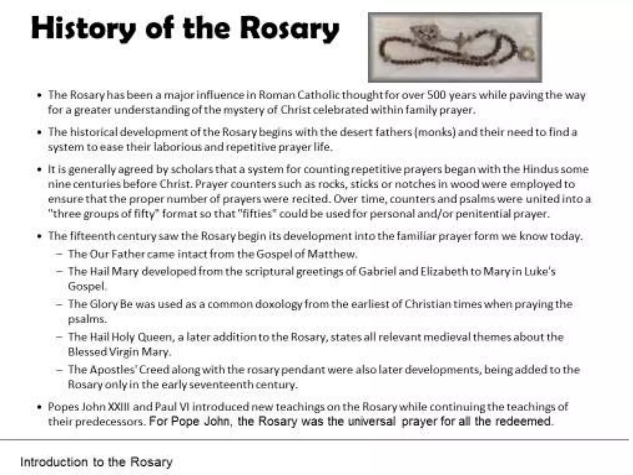 The Rosary is a vocal and mental prayer that meditates on Jesus' and Mary's lives while reciting prayers like the Hail Mary. It has been an important Catholic devotion for centuries.