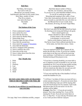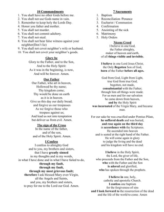 - Common Catholic prayers including the Our Father, Hail Mary, Glory Be, and prayers for contrition.