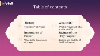 The document presents an Islamic discourse on the significance of prayer, detailing its historical origins, benefits, and importance within the faith. It emphasizes that prayer is the second pillar of Islam, mandatory for all Muslims, and serves as a means to strengthen belief and express obedience to Allah. Additionally, it highlights that neglecting prayer jeopardizes one's status as a Muslim and describes the teachings of the Holy Prophet regarding its value.