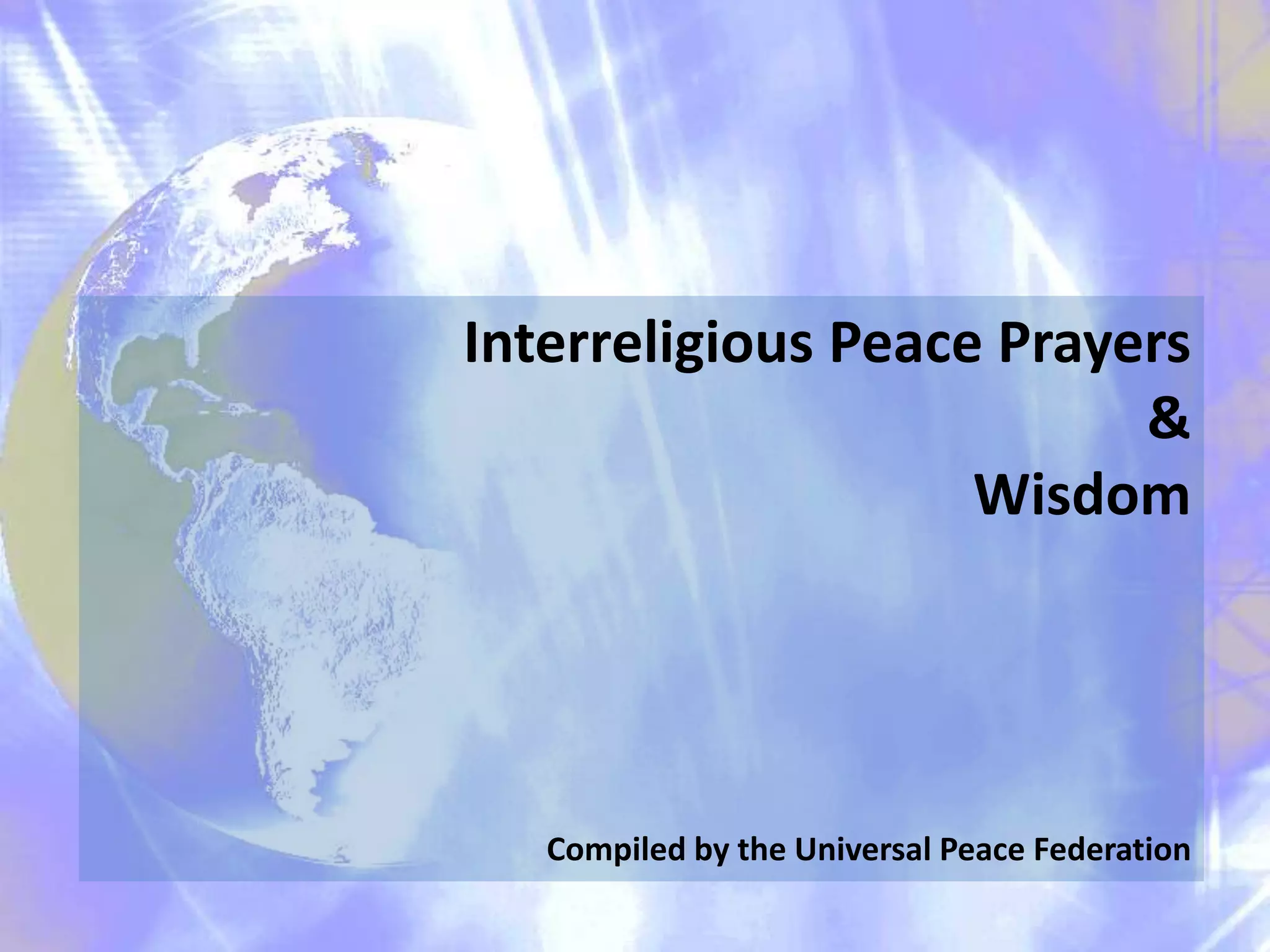 The document contains prayers for peace from various world religions and indigenous traditions, as well as teachings on peace. It begins with prayers from African, Native American, Buddhist, Christian, Hindu, Jewish, Muslim, Sufi, and interfaith traditions. It then shares brief teachings from Buddhist, Baha'i, Confucian, Christian, Jewish, Muslim, Shinto, Sikh, and continued Buddhist traditions. It ends with quotes on building a culture of peace and the interconnectedness of all people and our shared responsibility for the planet.