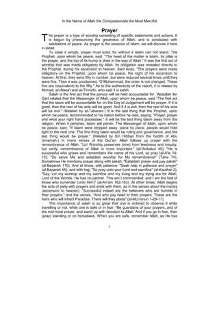 1. Prayer is a fundamental act of worship in Islam, consisting of specific statements and actions. It is considered the essence and pillar of Islam.