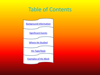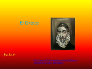 Domenikos Theotocopoulos, known as El Greco, was a renowned Greek artist born in Crete who is known for developing a unique style that blended elements of Renaissance and Byzantine art. He studied under the Cretan master painter Titan and later moved to Venice, Rome, and Spain, where he adopted the name El Greco. Some of El Greco's most famous works include The Burial of Count Orgaz and The Adoration of the Shepherds, painted in oils using elongated figures and dramatic use of color.