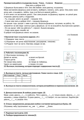Документ представляет собой проверочную работу по родному языку для учеников 4 класса и включает в себя текст о Дашеньке, её маме и тёте, отражая различные подходы к воспитанию. Ученики должны проанализировать текст, ответить на вопросы, выполнить задания на основе прочитанного и проработать пословицы. Работа включает задания на определение темы, тип речи, личные местоимения, словосочетания в переносном значении и другие языковые упражнения.